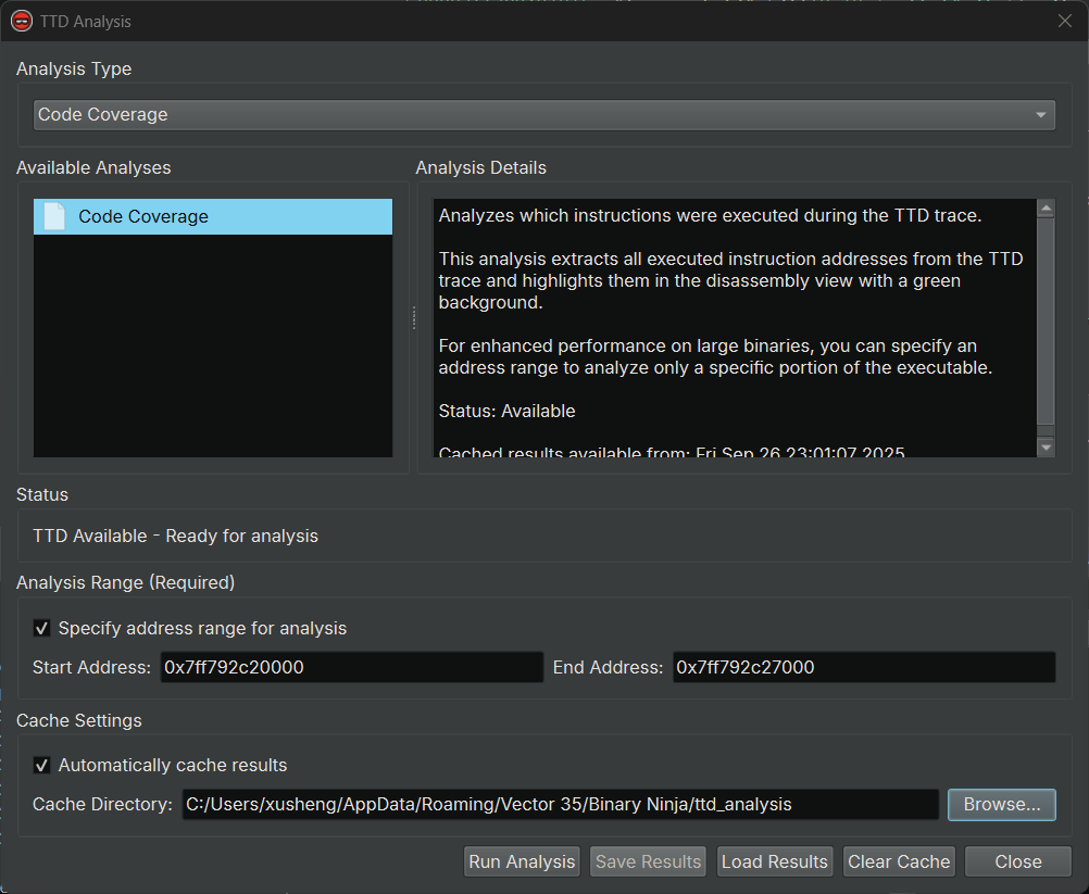 The TTD Analysis dialog provides advanced analysis capabilities for TTD traces, including code coverage analysis. This feature helps you understand which parts of the code were executed during the trace.