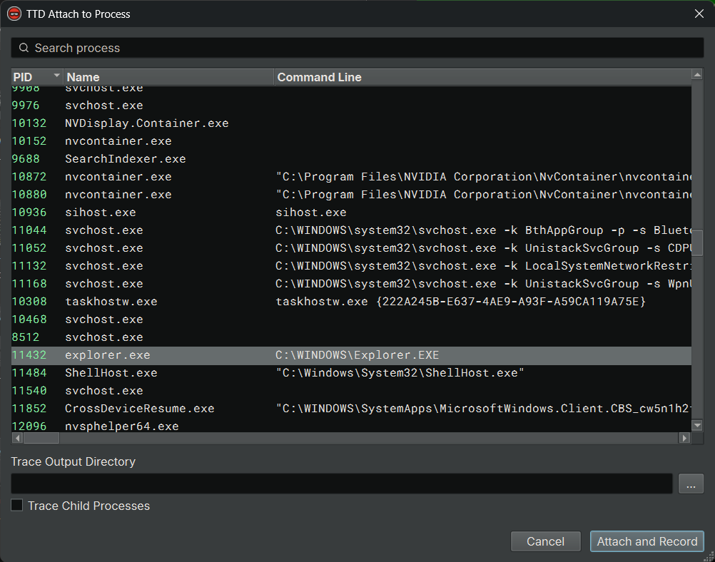 - For other types of recording or the available options, please check out the official guide at https://learn.microsoft.com/en-us/windows-hardware/drivers/debugger/time-travel-debugging-record