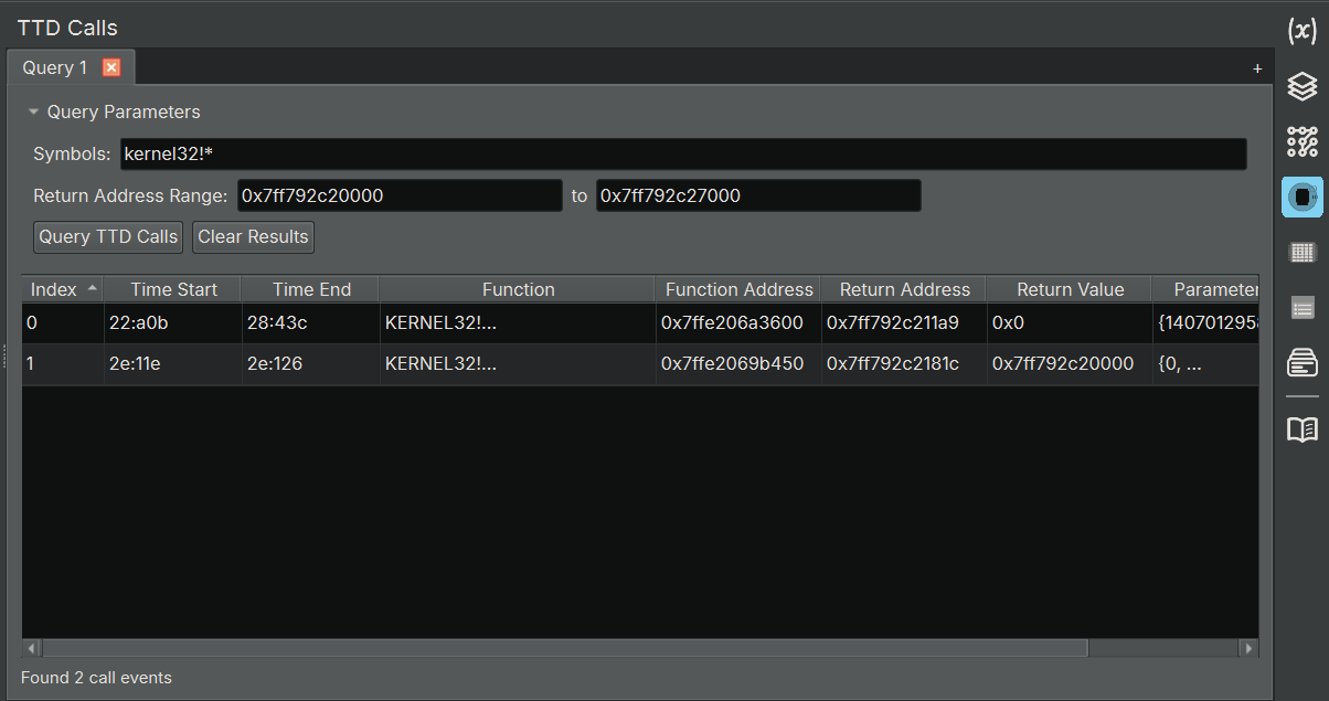 The TTD Calls widget allows you to query and analyze function call events from your TTD trace. This is equivalent to WinDbg's dx @$cursession.TTD.Calls() functionality but integrated directly into Binary Ninja.