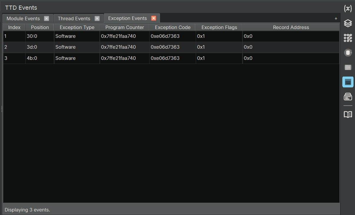 - Note: The TTD sidebar icons are hidden when you are not actively debugging. They will appear in the sidebar when you start a TTD debugging session.