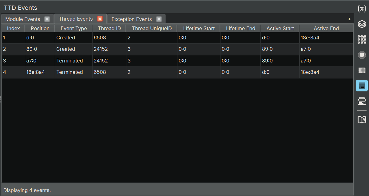 - Threads: Focused view showing only thread creation/termination events with relevant columns