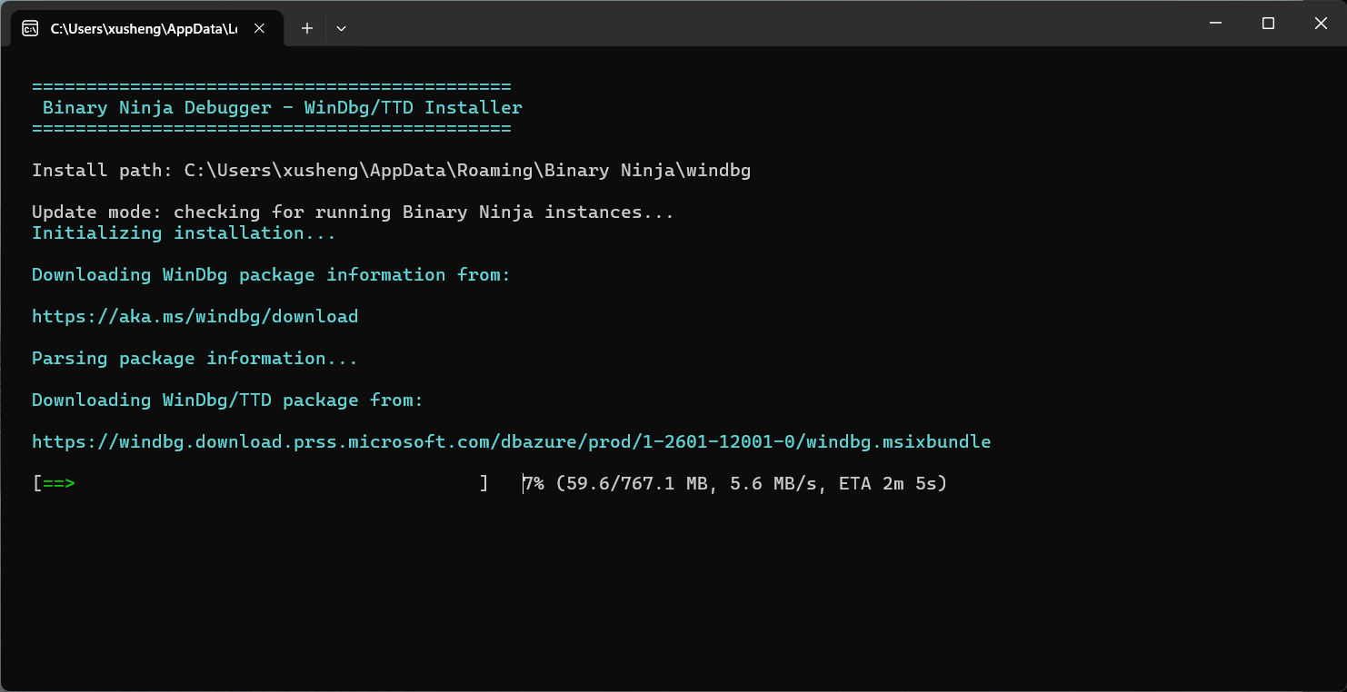%APPDATA%\Binary Ninja\windbg - Progress and status are displayed in real-time