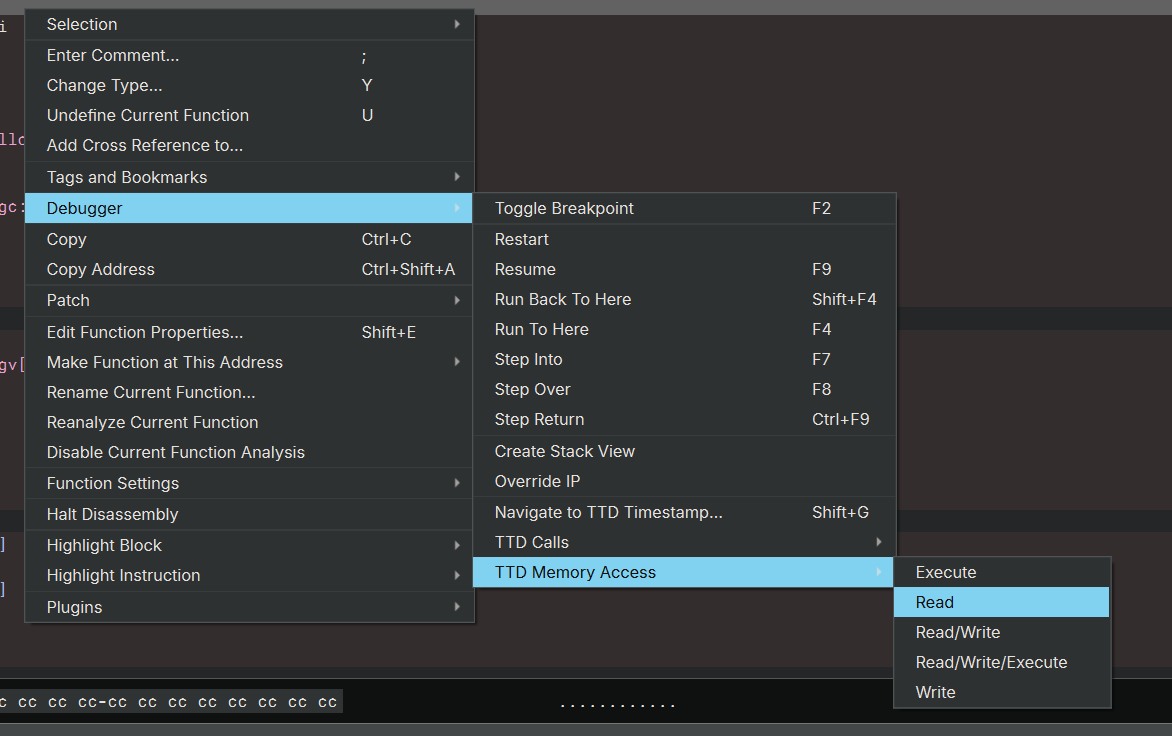 ⚠️ Important: All TTD queries (Calls, Memory, Events) execute synchronously and block the Binary Ninja UI until they complete. There is currently no way to interrupt a running query due to a WinDbg backend limitation. Long-running queries on large traces can cause the UI to appear frozen for several minutes.